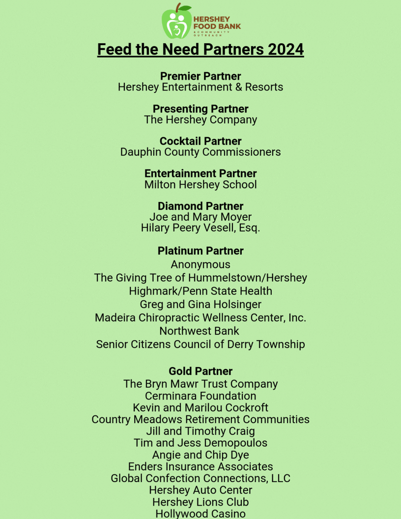 Feed the Need Hershey is the only fundraiser for the Hershey Food Bank. It is an all volunteer-organized fundraising event that showcases tastings from local chefs and restaurants.